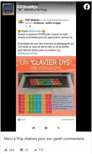 Le jeune homme dessine alors le clavier « R2dtooldys », un kit de stickers reproduisant un clavier azerty, divisé en huit zones de couleurs avec des raccourcis tels que « copier », « coller », « enregistrer », « imprimer » et la ponctuation. « L’objectif, c’était vraiment de faire gagner du temps aux élèves dans la prise de notes et de leur proposer un outil esthétique non stigmatisant ». L’expérience a en effet montré à Ryann que les enfants « dys » équipés d’outils informatiques à l’école sont souvent « mis de côté par leurs camarades » (article en lien ci-dessous). Or, aujourd’hui, ceux qui utilisent ce kit sont nombreux à affirmer que « plus c’est joli, plus ça passe ». « Un peu comme une décoration d’ordinateur finalement », ajoute Olivier Dubois, le père de Ryann, investi dans ce projet.