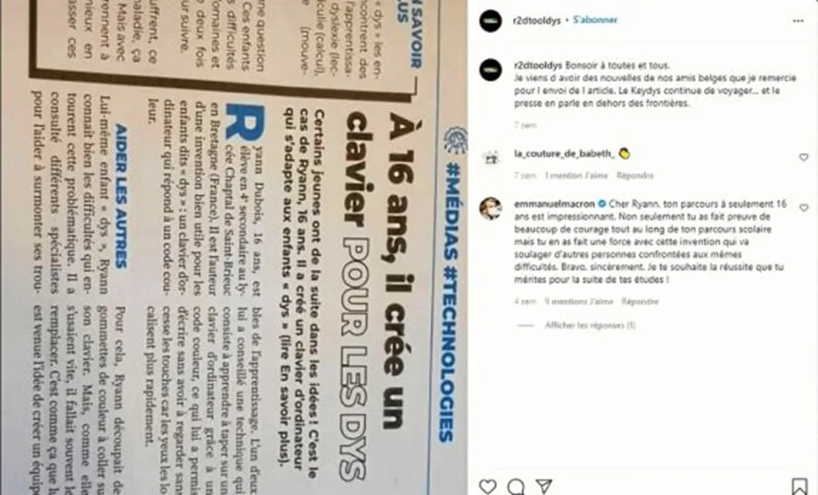 Le projet séduit jusqu’au sommet de l’Etat puisqu’Emmanuel Macron a salué en personne le dispositif sur Instagram. Ryann ne compte pas en rester là. Après avoir conquis de nombreuses familles -3 000 kits ont été vendus en France mais aussi en Suisse, en Belgique, au Québec, en Angleterre, au Mexique ou encore au Qatar-, le clavier Dys pourrait être proposé dans les établissements scolaires (article en lien ci-dessous). « J’ai échangé avec le recteur de l’Académie de Rennes au mois de décembre 2021 qui a décidé d’équiper certaines classes sur recommandation de la Maison départementale des personnes handicapées (MDPH). Il m’a également assuré avoir remis le projet entre les mains du ministre de l’Education nationale, Jean-Michel Blanquer », confie l’inventeur de R2dtooldys. Affaire à suivre.